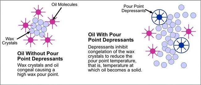 ‘In below-freezing temperatures, all paraffinic oils form wax crystals, which can hamper the oil’s fluidity (ability to flow). PPDs don’t stop crystal formation, but prevent wax crystals from agglomerating by reducing both the size of the crystals in the oil and their interaction with each other, allowing the oil’s continued fluidity at low temperatures.
