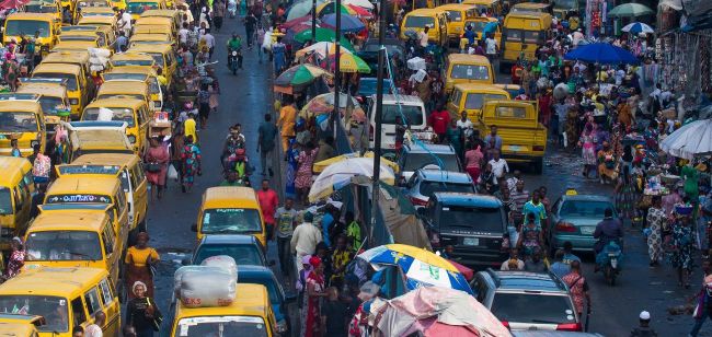 Overhead view of traffic congestion by public buses in Lagos, Nigeria.