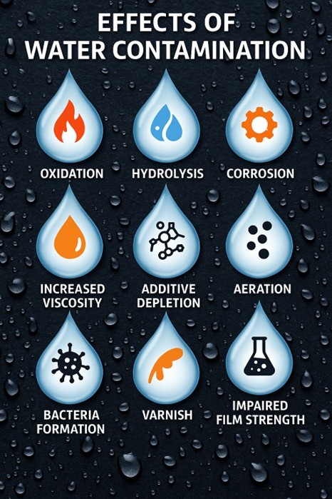 Water can hasten the oxidation of a lubricant and ultimately shorten its service life. It encourages the build-up of sludge and varnish, and causes metal parts to rust and corrode.