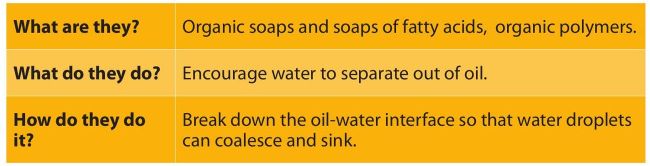 Demulsifier additives prevent the formation of a stable oil-water mixture or an emulsion by changing the interfacial tension of the oil, so that water will coalesce and separate more readily from the oil. This is an important characteristic for lubricants exposed to steam or water, so that free water can settle out and be drained off eas ily at a reservoir. Most engine, gear, hydraulic and turbine lubricants are formulated with this additive.